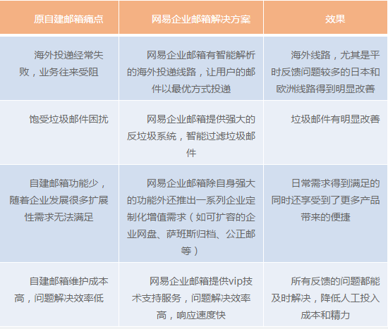 以往用户自建邮箱在海外投递、反垃圾和维护成本上一直无法满足需求,网易企业邮箱从用户实际情况出发,提供的最优解决方案,完美解决了用户的痛点问题。