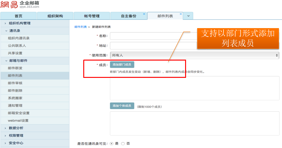人员调整,部门变动是企业不可避免的,但也会给企业管理造成一定程度上的困扰。比如部门调整,其部门下的成员也需要相应的调整,管理员的增删工作则需要随时跟进,而对于一些量级比较大的企业,对应的工作也会更加繁多。网易企业邮箱推出的动态邮件列表功能旨在为企业管理“减负”,解决需要根据部门成员变动而手动变更列表成员的痛点——动态邮件列表支持以部门形式添加列表成员,若部门内成员发生变动(新增/删除),邮件列表内成员会同步变化。动态邮件列表功能充分挖掘了邮件列表的使用潜力,降低了邮箱管理员的维护工作量。